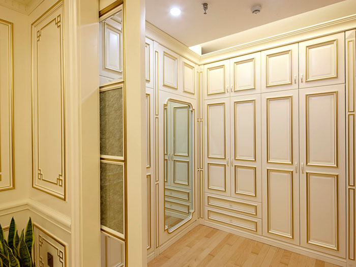 采用標準化機械生產,專業設計師上門測量設計后,對尺寸把握比較精確,全自動機器封邊保證了整體衣柜的密合度及精細度的高質量,大大提高了使用年限。結合科技元素,充分體現定制衣柜的風格多樣化。